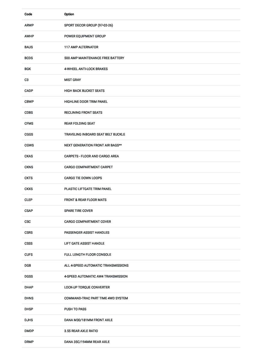 - According to the build sheet provided in the gallery, notable factory equipment includes the Power Equipment Group with power-operated locks, windows, and mirrors, 15-inch wheels, a Command-Trac part-time 4WD system, cloth upholstery, air conditioning, and more as detailed below. The selling dealer reports no notable modifications.